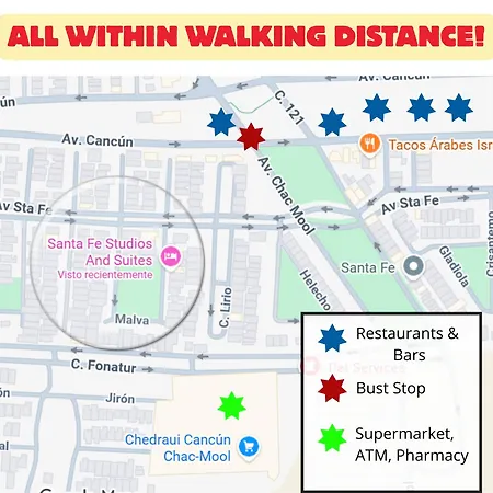 Estadio Beto Ávila ist ungefähr 4 Kilometer vom Hotel entfernt. Zu den Sehenswürdigkeiten, die in etwa 15 Fahrminuten Entfernung vom Santa Fe Studios And Suites Cancún sind, gehört die Iglesia de Cristo Rey. Der Parque Urbano Kabah liegt in circa 3 km Entfernung von dieser Unterkunft. Das Hotel liegt in einer Entfernung von 22 Autominuten vom Flughafen Cancun.